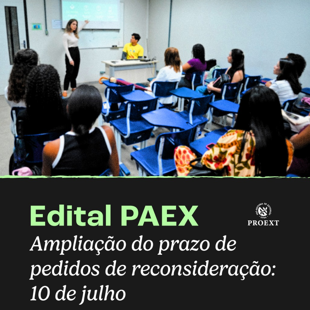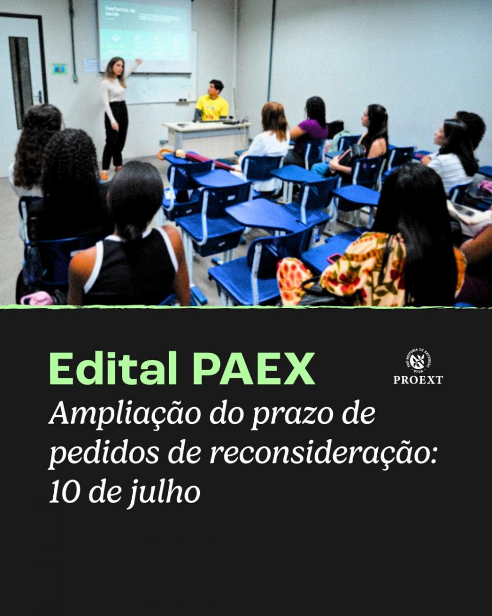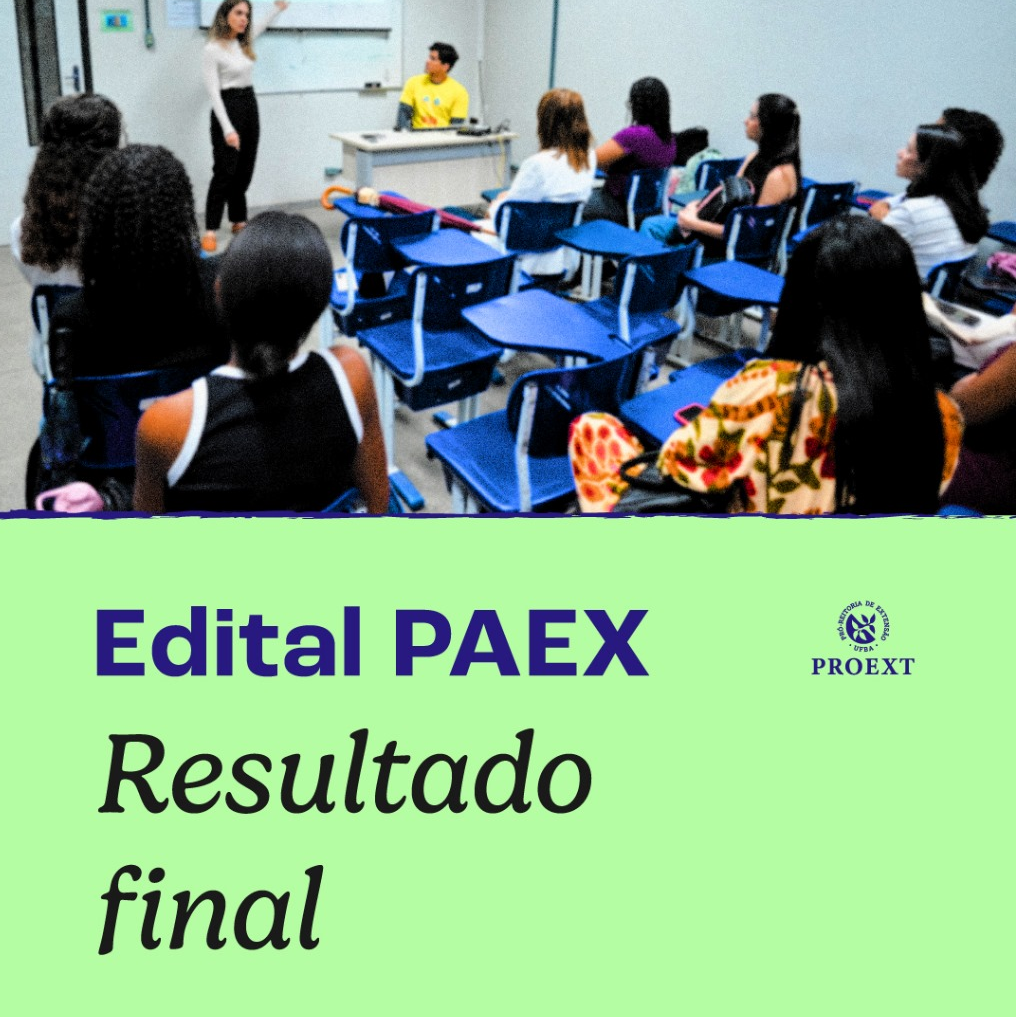 A Pró-Reitoria de Extensão Universitária (PROEXT) informa o resultado final do edital Programa de Apoio à Extensão Docente (PAEX) 2025, após a apreciação dos recursos, cujo prazo de solicitação ficou aberto até 10/07/2025.