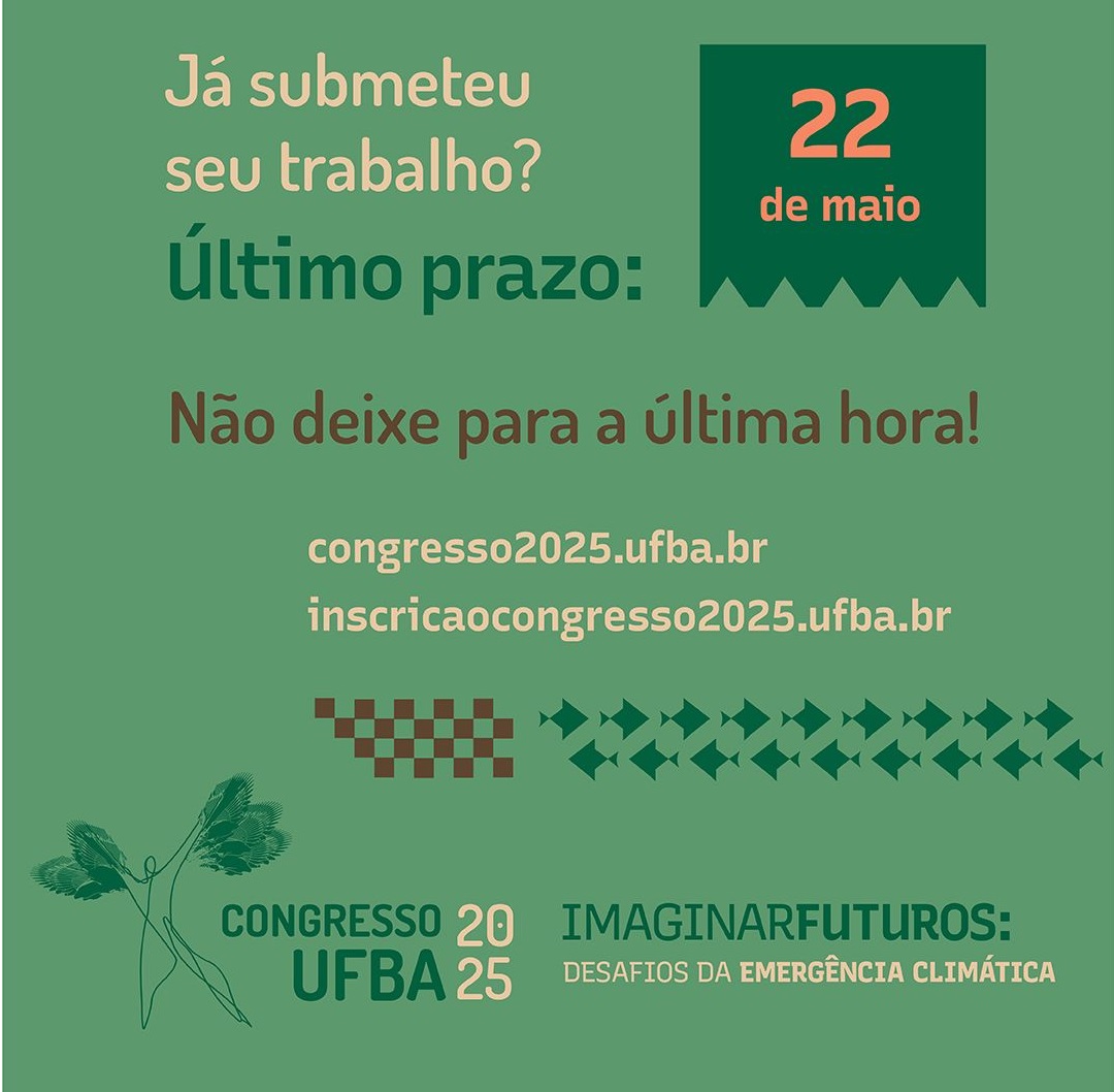 Encerra hoje o prazo de submissão de trabalhos no Congresso UFBA 2025! As pessoas interessadas têm até o fim do dia para inscrever produções em três modalidades: apresentação oral, mesa (incluindo outras formas de discussão) ou intervenção artística.